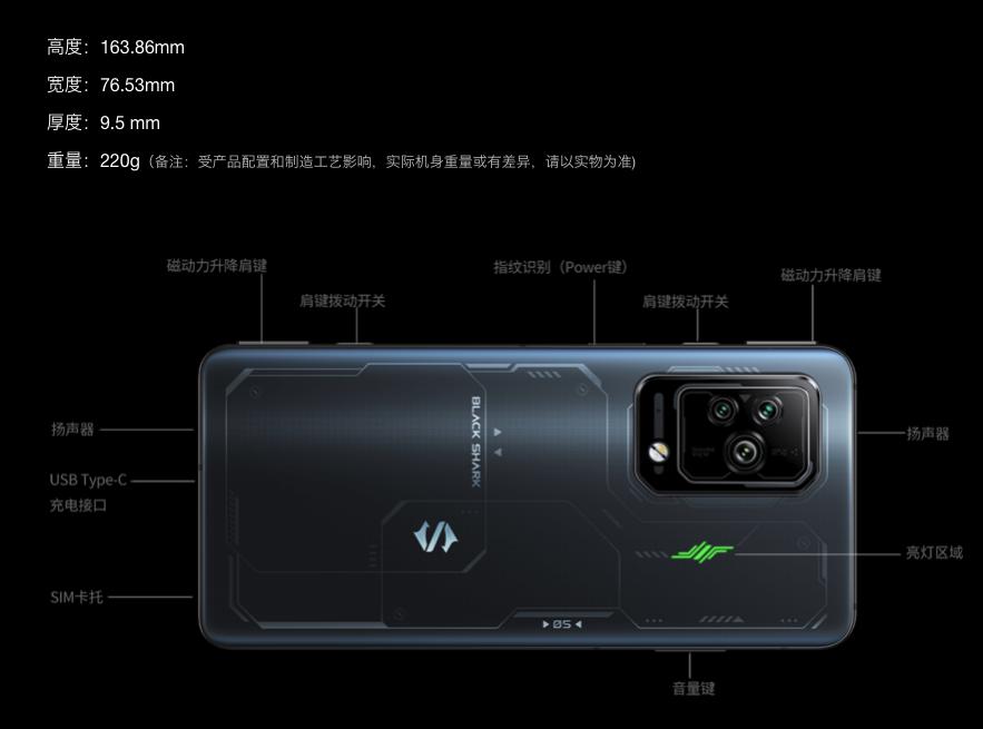 黑鯊 5 Pro 厚度 9.5mm,重量 220g;