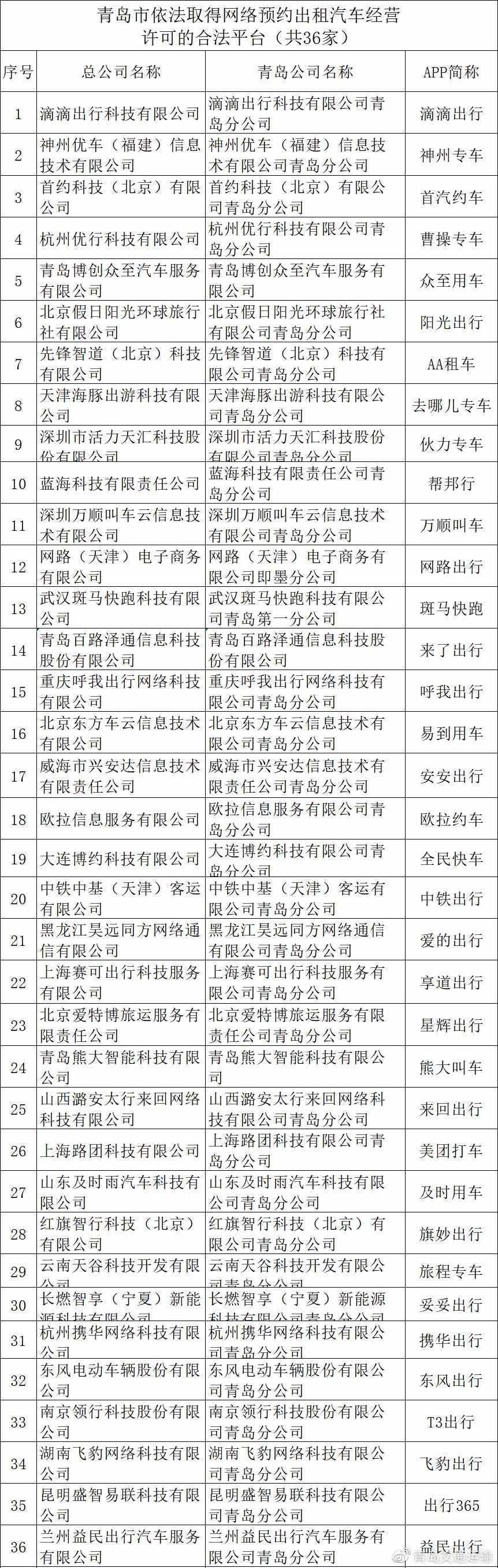 截至目前,在青島市依法取得網絡預約出租汽車經營許可的合法平臺共有 36 家。市交通運輸執法部門提醒廣大市民在搭乘網約車出行時,使用合法合規平臺。