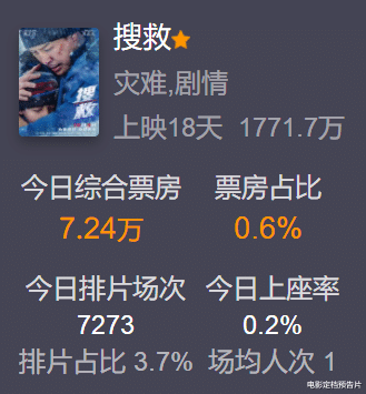 《搜救》日票房跌至7.2萬,成國慶檔票房最低影片
