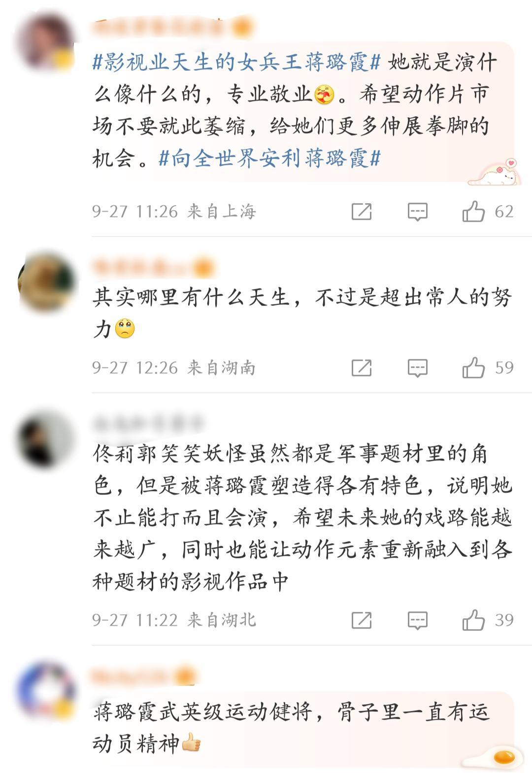網友紛紛評論蔣璐霞,“女兵王蔣璐霞!姜璐霞真的是在鍛煉,為了演好每一個角色,挑戰自己的極限。她飾演的女兵,真能看出女兵的堅韌,而且她是女人,不讓男人的氣質真的很棒,國內的娛樂圈需要這么好的演員。”