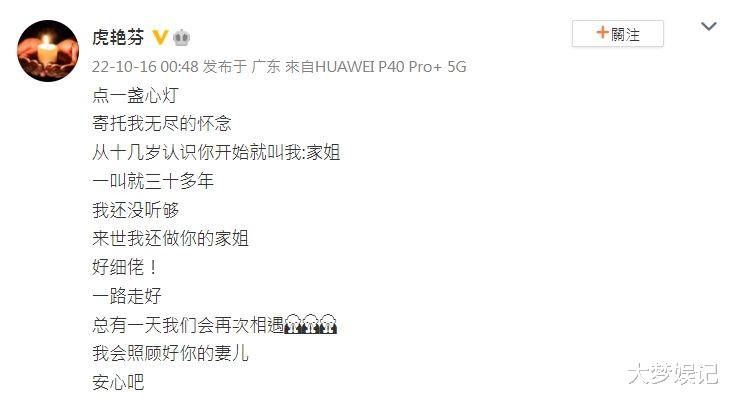 陳堅(jiān)雄是“國家一級演員”,在情境劇《外來媳婦本地郎》扮演“蘇貴元”一角,該劇至15日晚間播出時(shí)還有他的戲份。而戲里扮演他姐姐“蘇妙蟬”的女星虎艷芬發(fā)文,連續(xù)3聲“為什么?為什么?為什么”難掩震驚,“留下女兒呼喊爸爸?留下妻兒今后怎么過?拉著你冰冷的手多希望你是和我開玩笑!叫了我30多年家姐了多希望你能再叫我一聲:家姐!拼命叫你的名字能聽到嗎?陳堅(jiān)雄!陳堅(jiān)雄!陳堅(jiān)雄!讓我們大家記住他!讓我再送你最后一程吧!來世還當(dāng)我弟弟。”