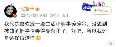 張馨予發出這篇文章后,一些網友和營銷號開始過度解讀,曲解她的意思,導致這件事復雜化。當事情開始發酵時,張昕宇沖上社交平臺回應:“我只是喜歡發一些生活中的趣事,沒想到被人曲解,把事情復雜化了。好吧,那我就一直這樣。”這番硬核回應也明確了張馨予的態度,更是啪啪打了某些過度曲解網民的臉。