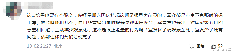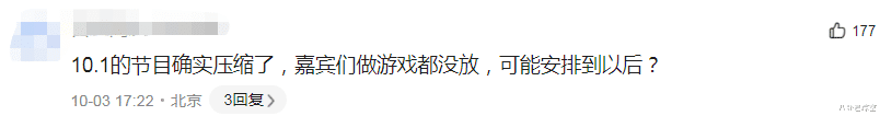 不過在10月1日的那一集里,時長減少了40分鐘,就算是未播的一集,也要保持基本時長,把節目從90分鐘縮短到50分鐘,有點夸張。但也有網民稱,央視當天也有一檔節目,是對其他節目讓步的致敬。