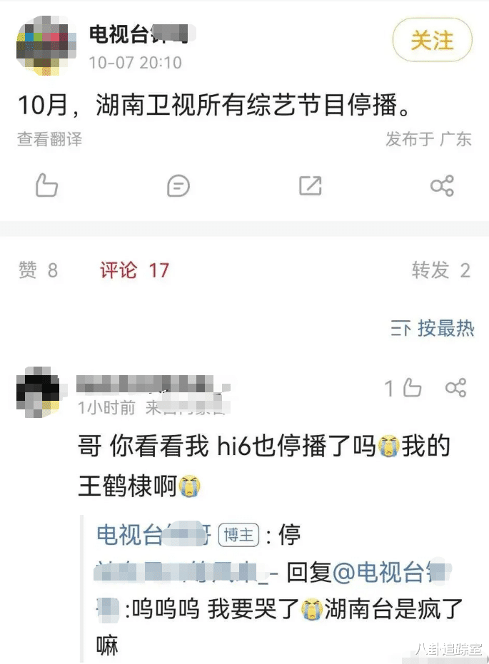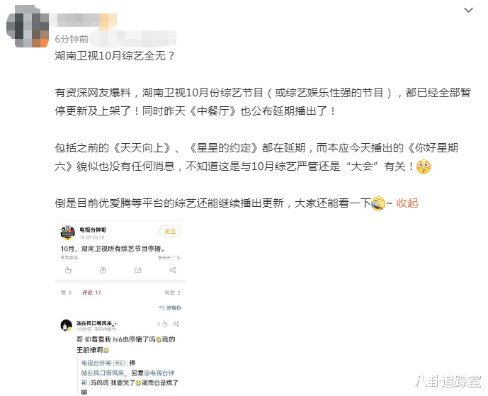 10月8日,一位知情的網絡用戶爆料稱,他的昵稱是電視臺的工作人員,看起來很可信。并且爆料芒果臺10月份的綜藝節目將停播。在這個階段,所有更新都已停止,尚未發布的程序也將延遲。