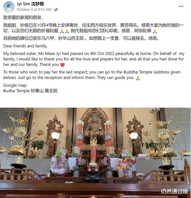 沉妙姬的妹妹也在沉妙姬的社交賬號(hào)上發(fā)文,證實(shí)沉妙姬于10月4日晚安詳離世,骨灰和牌位安放在馬六甲妙華山藥王苑。