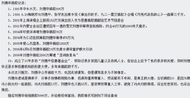 隨后,人們發現,捐款10萬并非劉德華的本意,因為捐款當時,劉德華和馮小剛張國立在一起,張國立和馮小剛都只捐了10萬,出于尊重,當然也是為了避免尷尬,劉德華也就隨大流,捐了10萬!