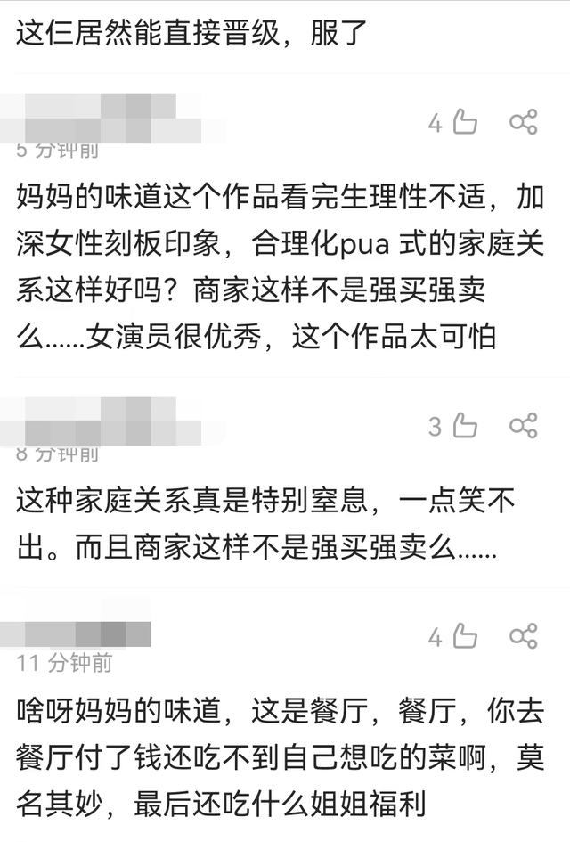 我知道編劇是想呈現出一個,媽媽其實就是無怨無悔地為我們服務的“服務員”,我們應該為此感動。