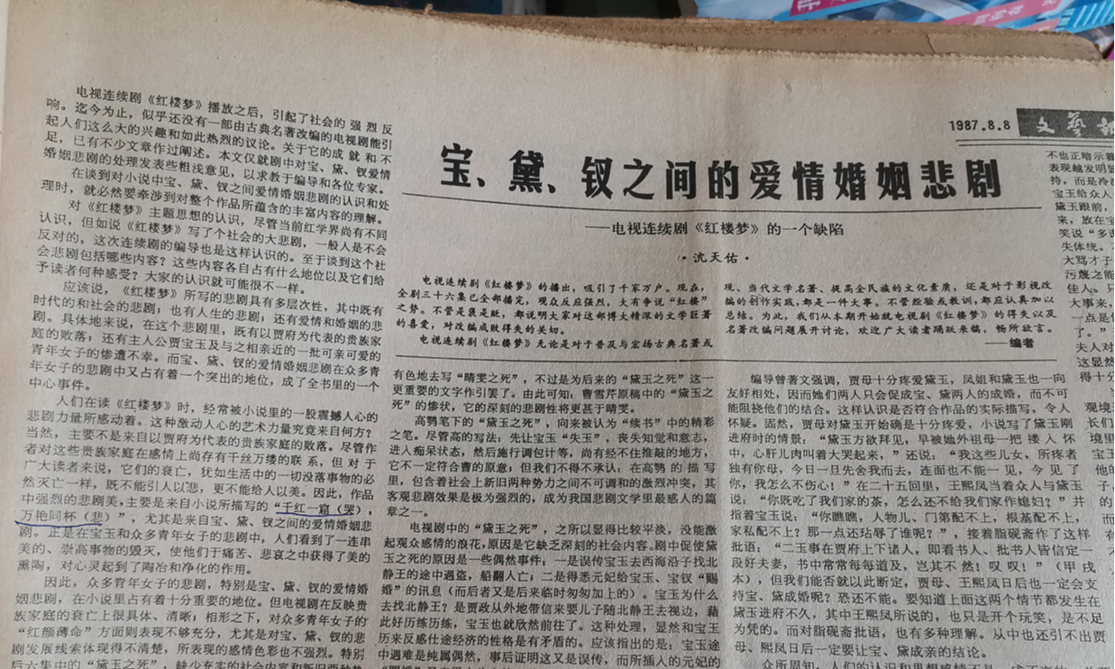 一、第一篇文章發(fā)表在1987年8月8日的《文藝報(bào)》上,題目為《寶、黛、釵之間的愛情婚姻悲劇》,作者沈天佑。