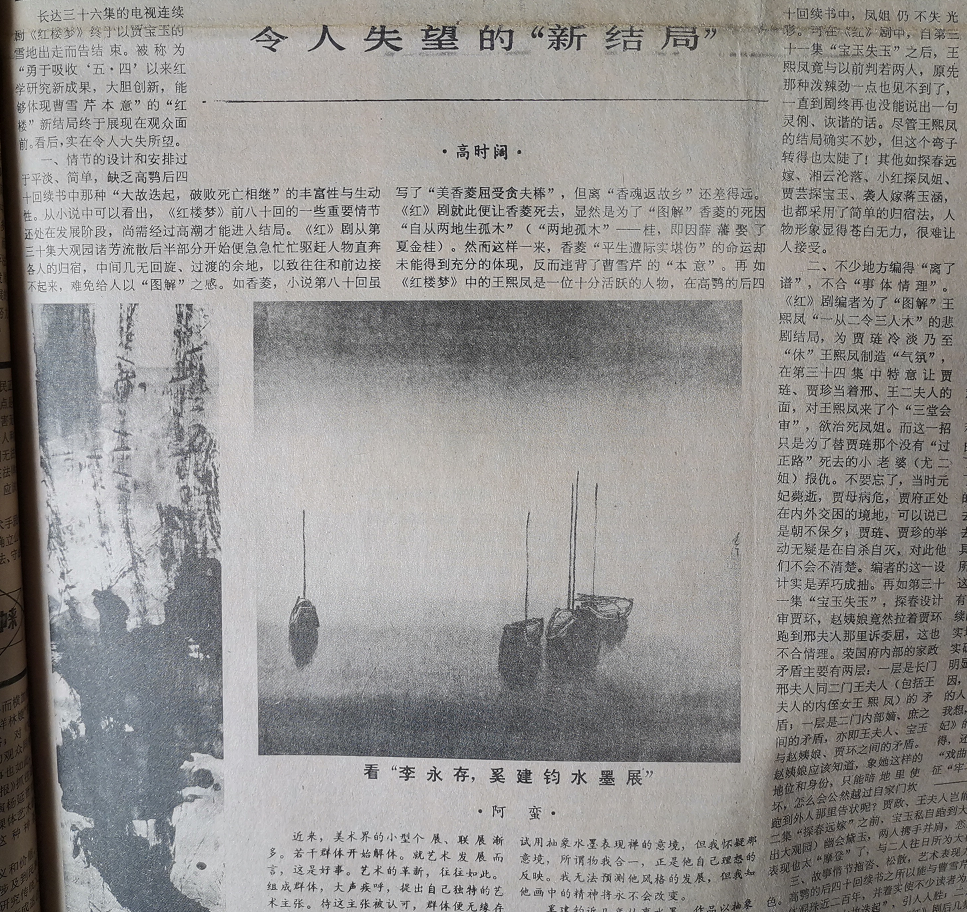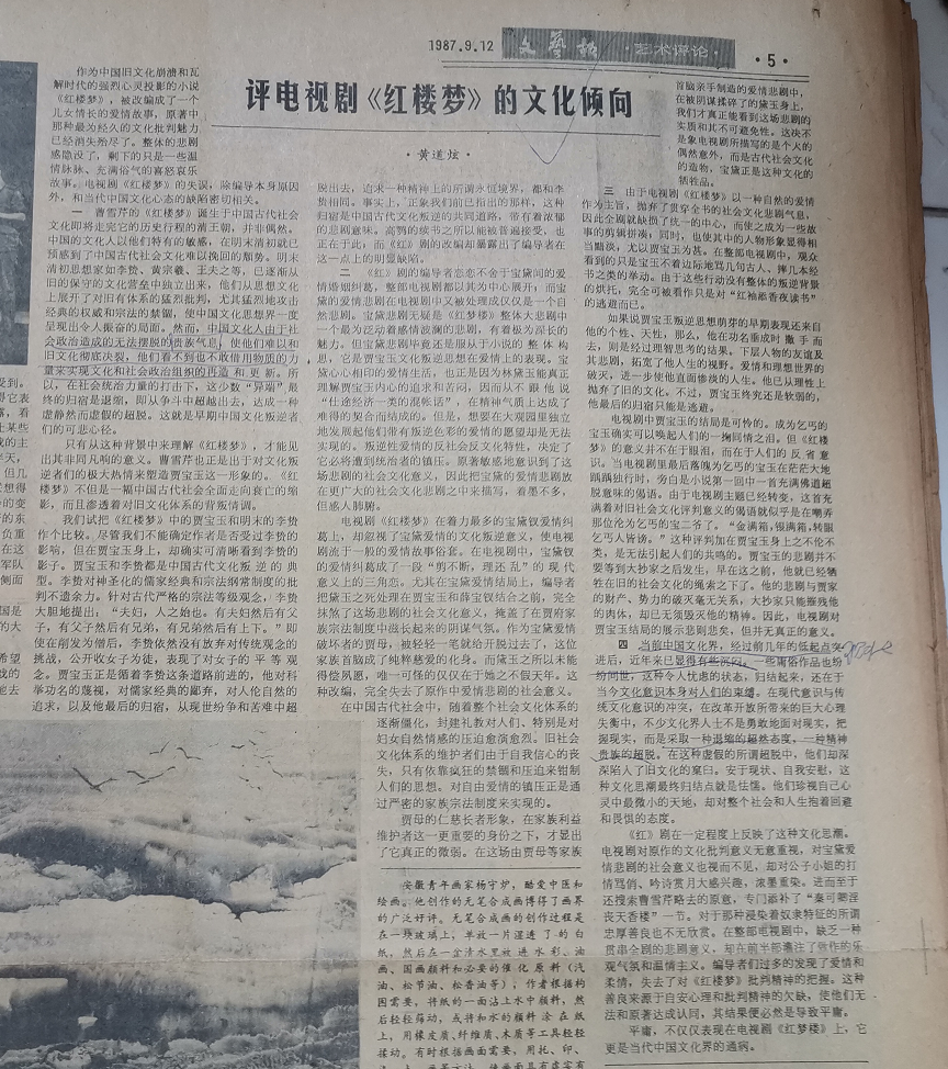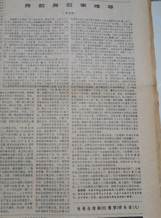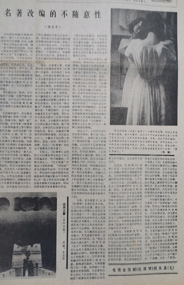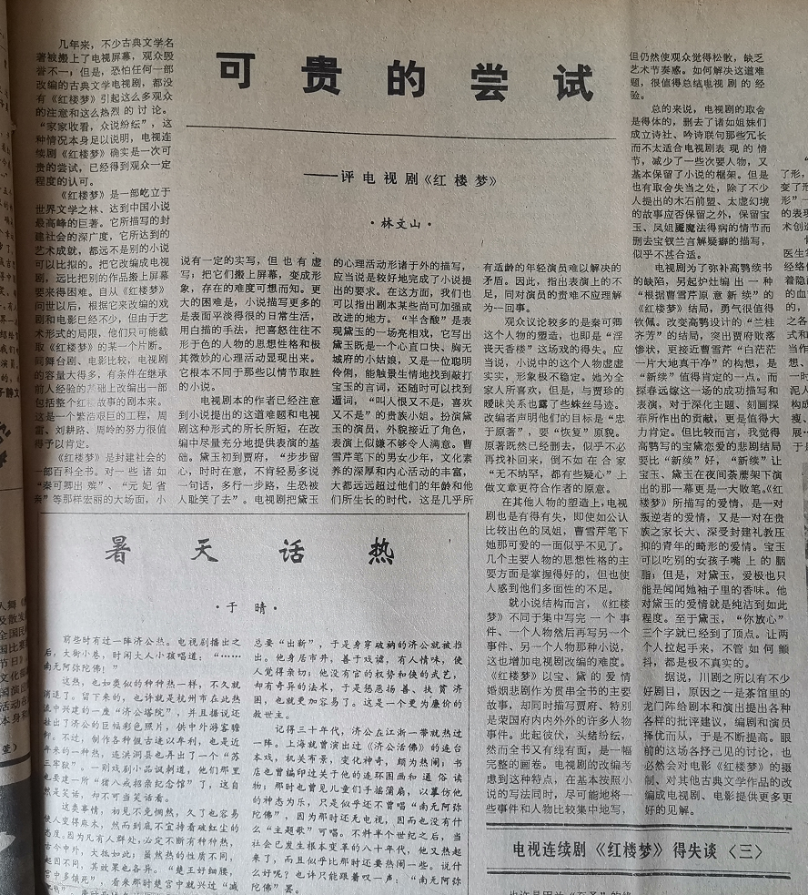 我們不妨看一下1987年的《文藝報(bào)》專門為電視劇開辟了一個(gè)“得失談”的專欄,共發(fā)表了八篇文章,沒有一篇文章是為電視劇唱贊歌的,全部是批評電視劇的失敗之處,好像不說一下《紅樓夢》的敗筆,就好像不能跟上當(dāng)時(shí)的風(fēng)評潮流。