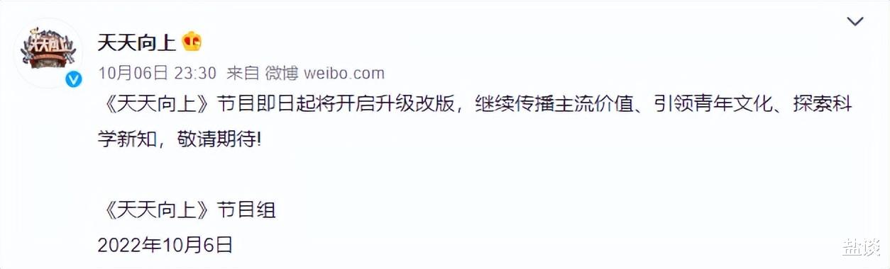 10月6日晚上23點30分,《天天向上》官方微博宣布“改版升級”,這個存在了14年的老節目,也追隨著他“前輩”《快樂大本營》的腳步,走向歷史。