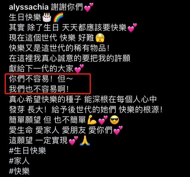只不過,生日本來是一件高高興興的事情,可是賈靜雯的親生文案卻略顯傷感,她說要把自己的生日愿望送給下一代。一句:“你們不容易,但我們也不容易啊”,則引起了不少粉絲的關注。
