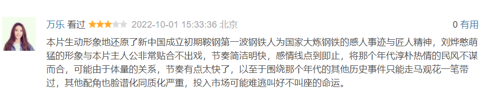 有人稱:本片生動形象地還原了新中國成立初期鞍鋼第一波鋼鐵人為國家大煉鋼鐵的感人事跡與匠人精神,劉燁憨萌猛的形象與本片主人公非常貼合不出戲,節奏簡潔明快,感情線點到即止,將那個年代淳樸熱情的民風不謀而合,可能由于體量的關系,節奏有點太快了,以至于圍繞那個年代的其他歷史事件只能走馬觀花一筆帶過,其他配角也臉譜化同質化嚴重,投入市場可能難逃叫好不叫座的命運。有人稱:
