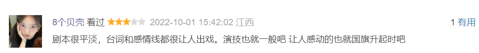有人稱:劇本很平淡,臺詞和感情線都很讓人出戲。演技也就一般吧 讓人感動的也就國旗升起時吧