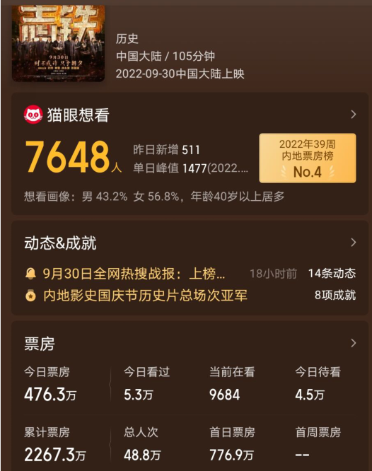 《鋼鐵意志》上映的首日票房只有776萬,這是什么概念呢?