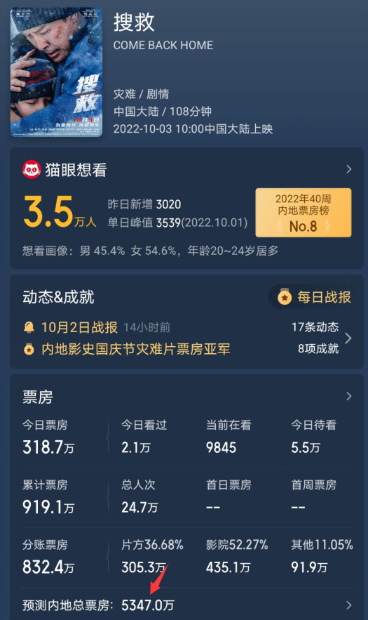數據方面,《《搜救》》的預售票房僅為199萬,首映日預測票房為600萬,專業數據網站預測這部電影的總票房為5300萬!