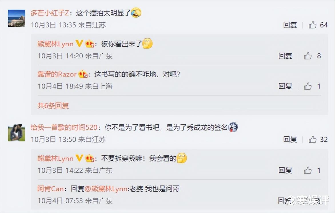 然而有趣的是,熊黛林看到這些酸式評(píng)論后,不僅沒有表現(xiàn)出不開心,反倒挨個(gè)去回復(fù),承認(rèn)自己確實(shí)有擺拍,但不完全是為了秀成龍的簽名,表示還是會(huì)認(rèn)真去看完這本書。