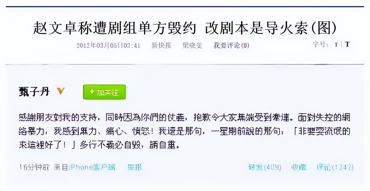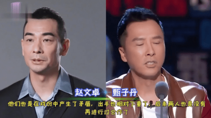 大概情況就是,趙文卓說甄子丹臨時改劇本和人設,還有戲份,這讓趙文卓很不滿,說甄子丹沒有契約精神,而甄子丹也不是好惹的,一時間兩個人各說分詞!