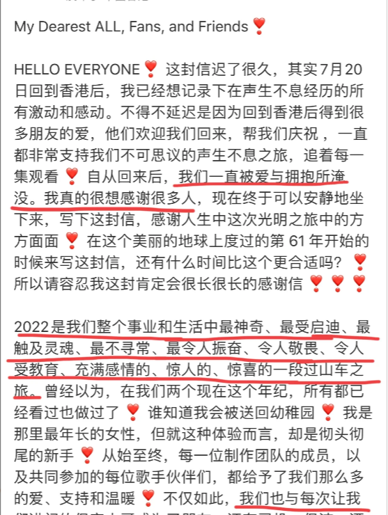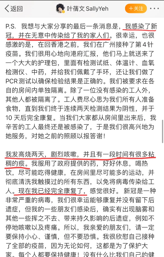 甚至,她還在回去后就中招了,確診了新冠,高燒、咳嗽、頭暈,使她十分的難受,還傳染給了家人,好在一起都挺過(guò)來(lái)了,已經(jīng)痊愈了。葉倩文十分的感謝所有人的支持與幫助,她之所以要等到這個(gè)時(shí)候,才發(fā)出來(lái)這份很長(zhǎng)很長(zhǎng)的感謝信,也是為了讓大家不為她擔(dān)心,希望所有人都能開(kāi)心。