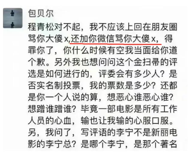 包貝爾10月3日,疑似包貝爾的朋友圈曝光,他發文大罵“金掃帚”獎的主辦人程青松,因為他導演的《陽光姐妹淘》被分類在“最令人失望的導演”一欄。