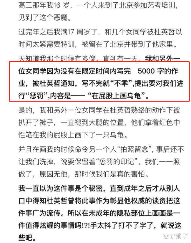施子怡在長文中提到,杜英哲曾經自曝睡過100多名女學生,洋洋得意自封為“電影屆的教父”。在他成立機構的15年里,基本每一屆都有女生被他騷擾過,他誘奸多名未成年女生,有的導致她們輟學,甚至有女學生曾為他墮胎。
