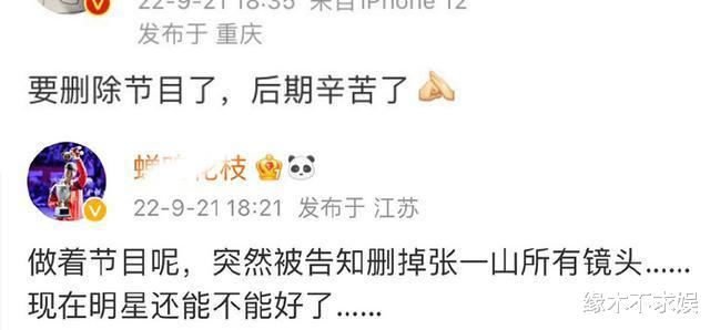 這位博主爆料:“做著節(jié)目呢,突然被告知?jiǎng)h除張一山所有鏡頭,現(xiàn)在明星還能不能好了”。在他之后,又有不少博主相繼爆料被通知要?jiǎng)h除張一山的鏡頭。