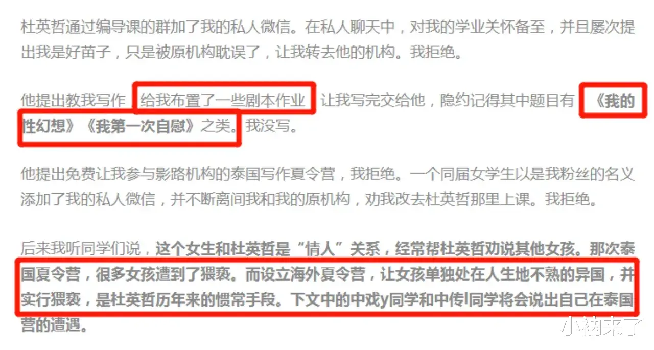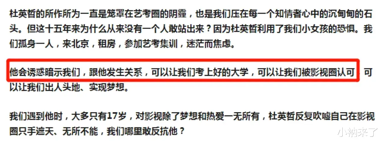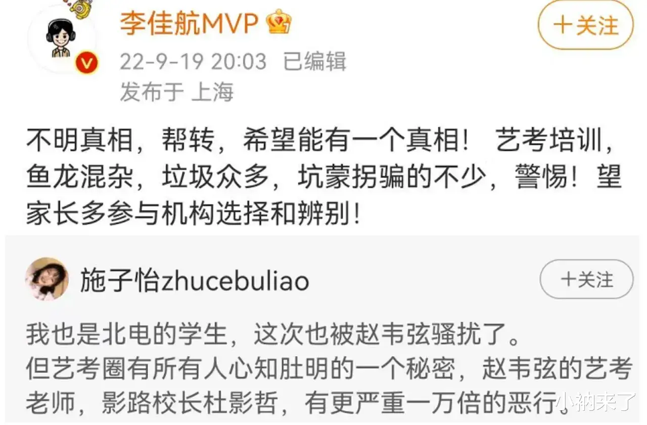 9月20日,許久沒有露面的李佳航突然發聲,竟然是力挺一位北電女學生,而這位女學生的爆料內容簡直是太毀三觀,竟然是實名舉報某藝考機構校長性騷擾多名女生,長達15年!原來,一名叫施子怡的女網紅,目前是北電的學生,她發文實名舉報知名藝考機構影路站臺的校長杜英哲,利用校長的身份在長達15年的時間里,導致上百位女孩子被猥褻騷擾,更離譜的是竟然還讓一個未成年的女孩子為他生下孩子……本來這件事爆出后關注的人很少,但是男星李佳航看到后第一時間轉發,引起了網上的軒然大波,事情迅速發酵起來。藝校出身的他可能更有體會,所以出面力挺:不明真相,幫轉,希望能有一個真相! 藝考培訓,魚龍混雜,垃圾眾多,坑蒙拐騙的不少,警惕!望家長多參與機構選擇和辨別!聽到這個消息,很多人留言說:如果這事是真的,那這個校長太垃圾了,必須嚴懲!多少個女孩子葬送在他手里!這么多年都沒曝光,可見這個人藏的有多深,底盤有多大!趕緊徹查清楚!還有沒有別的“幫兇”!多少個女孩子敢怒不敢言,人渣簡直是!以為自己可以只手遮天了?還有人喊話:唐山事件時,李佳航也是第一批出來發聲的藝人,如今又第一時間轉發了此事,這樣的藝人才配稱為藝人!他在用他的影響力去讓事情被更多人看到!娛樂圈敢于發聲的藝人越來越少,很多人都怕自己受到牽連,李佳航是個爺們。希望這件事能在他的擴散下,受到重視和徹查到底,還受害女孩子一個公道。