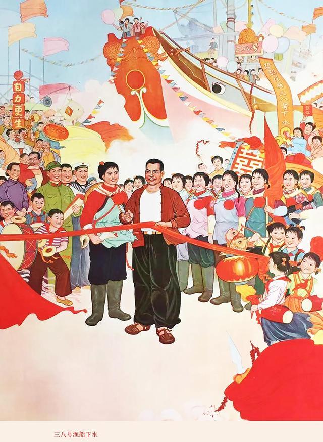 1.解讀、賞析:這幅年畫作品的標題為《三八號漁船下水》,劉以通,1975年。