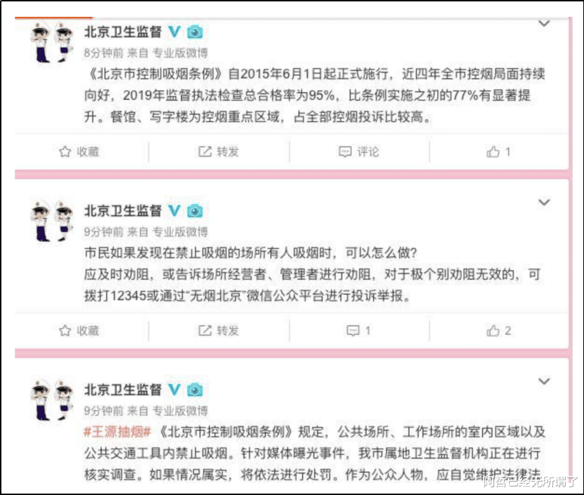 除了網(wǎng)友的譴責(zé),北京衛(wèi)生監(jiān)督也多次發(fā)微博對王源吸煙一事回應(yīng),表示“調(diào)查正在進行中,如果屬實,將依法予以處罰?!?/p>