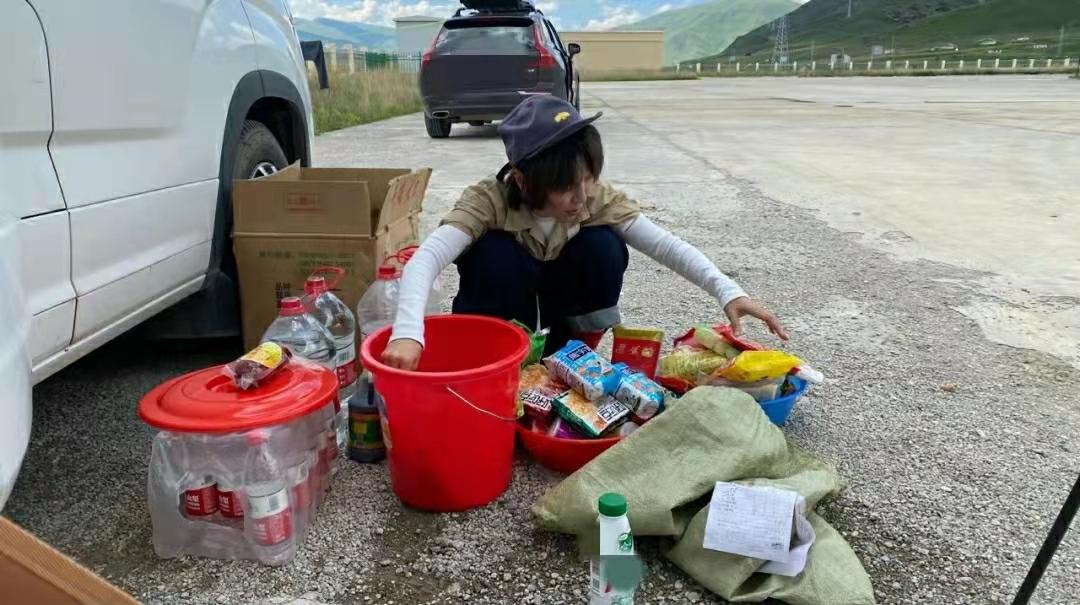 不得不說,這幾個紅色的大桶出鏡率太高了,它們不僅承擔著打水的功能,還兼顧著裝物資和零食的作用,黃雅莉則蹲在地上認真地分揀著物資,一副投入的模樣。