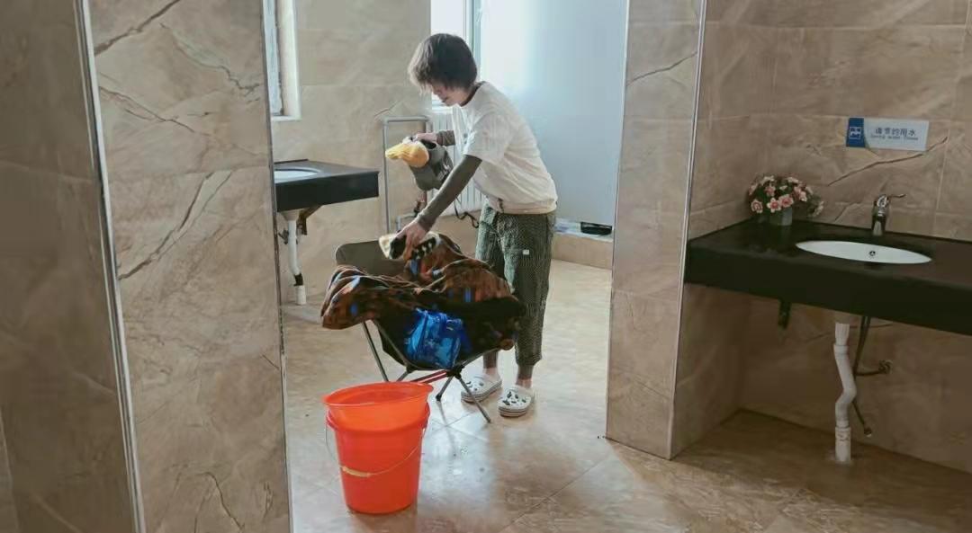 據曬出的照片,黃雅莉都是從服務區的公共廁所用桶和盆接的水,借此來洗澡洗衣。