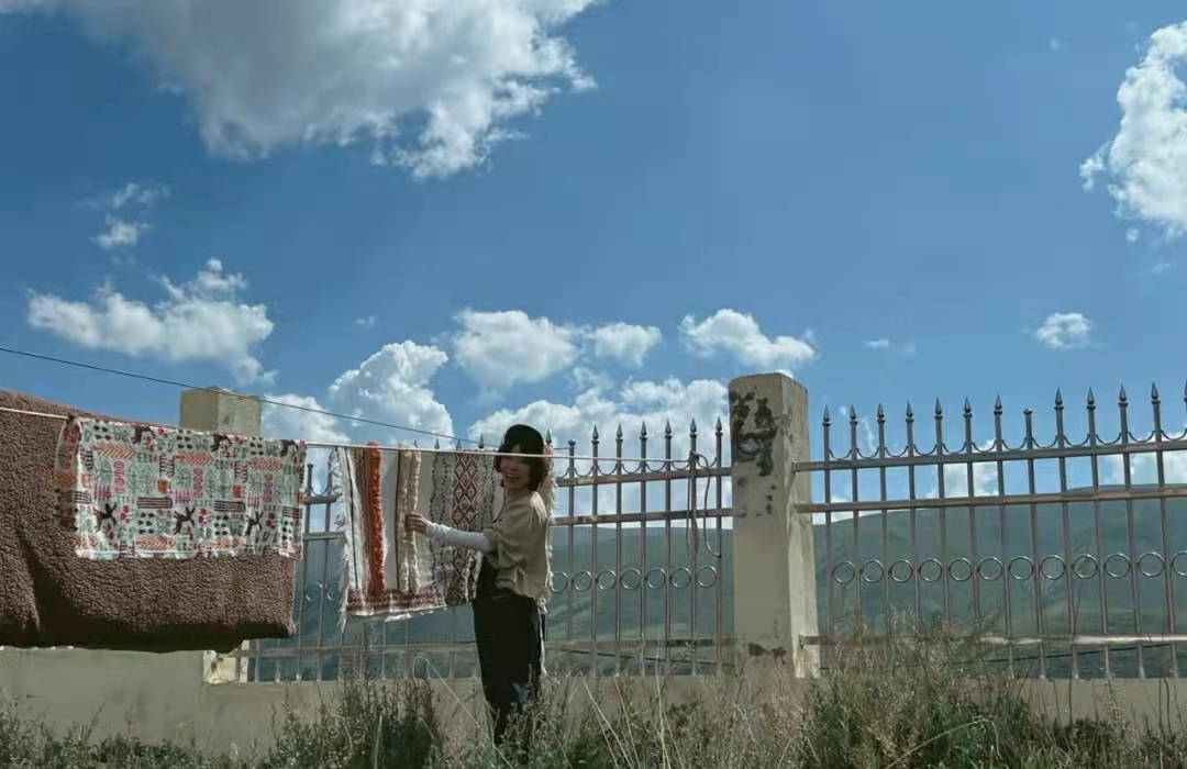 黃雅莉還在草地上晾起了衣服和床單被套,雖然條件有些簡陋,但是她站在陽光下滿臉的笑容,似乎心情十分不錯。
