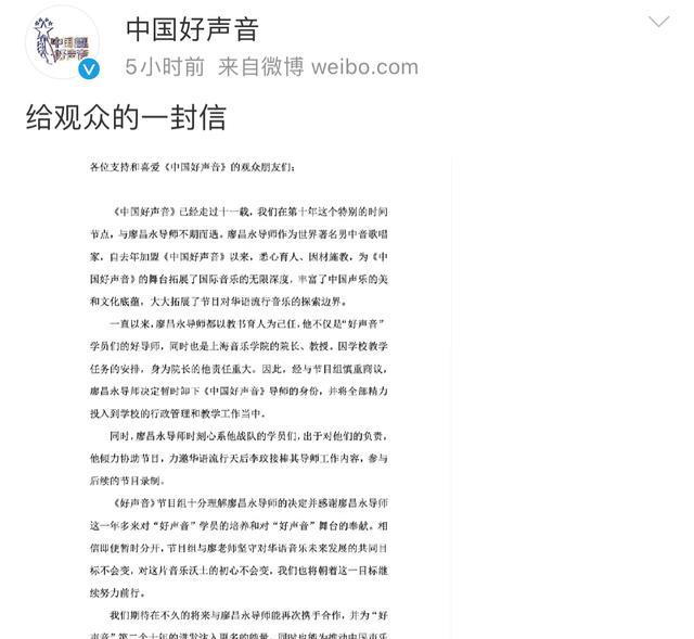 就在幾個小時前,《中國好聲音》節目的官方社交媒體發布了一封給觀眾的信。