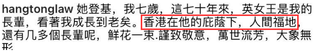 獻(xiàn)花致哀結(jié)束后,羅家英不舍乘車離開,并在其社交網(wǎng)寫道:“她登基,我才七歲,這七十年來,英女王是我的長輩,看著我成長到老矣”。自稱“女王看著自己長大的”羅家英,表示“香港在她的庇蔭下,(成為)人間福地”,借此他執(zhí)鮮花一束、謹(jǐn)致敬意,萬世流芳,大象無形!