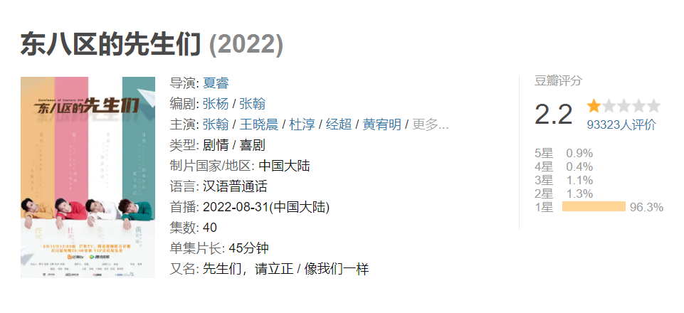 在《東八區(qū)的先生們》更新前,豆瓣網(wǎng)的最低分是2.1分,由1999年的《秦可卿之謎》和2020年的《雷霆戰(zhàn)將》共同保持,張翰的這部戲如果后續(xù)劇情無法扭轉(zhuǎn),創(chuàng)新低是大概率事件!