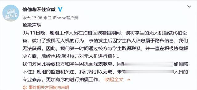 “致歉聲明9月11日晚,劇組工作人員在拍攝區域準備期間,誤將學生的無人機當做代拍設備,做出了投擲無人機的行為,事情發生后因學生私人信息屬于隱私信息,我們無法獲得,因此,我們第一時間通過校方與學生取得聯系,并一直在積極協商解決方案,后續也將通過校方對無人機進行賠付。