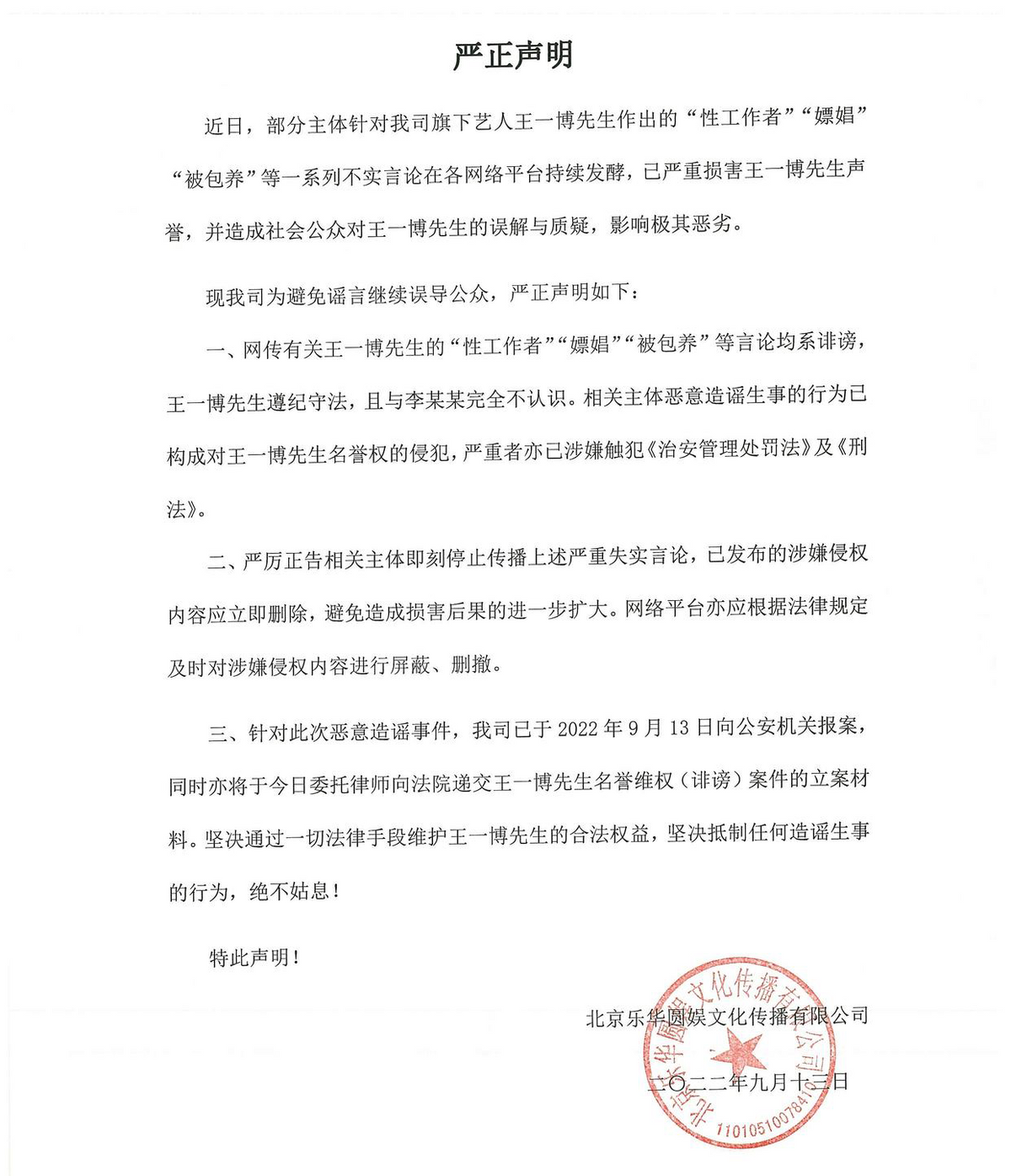 為此,王一博公司不得不發出聲明,對于網絡上各種不實的言論均為誹謗、并強調王一博自始以來遵紀守法,與散布謠言的李某某完全不認識。除此之外,公司還表明已經報案,通過一切法律手段來維護王一博的合法權益,嚴厲抵制造謠生事的行為,絕不姑息。同時,還向造謠者發出嚴厲正告,要求立刻停止一切不實言論。