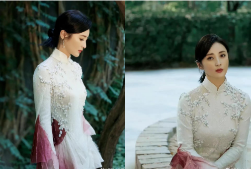 當天,蔣勤勤身穿一身中式白色禮服搭配粉紅色的薄紗,五官精致、腰肢纖細,尤其是禮服上還鑲嵌著國花,典雅脫俗的氣質展現地淋漓盡致。
