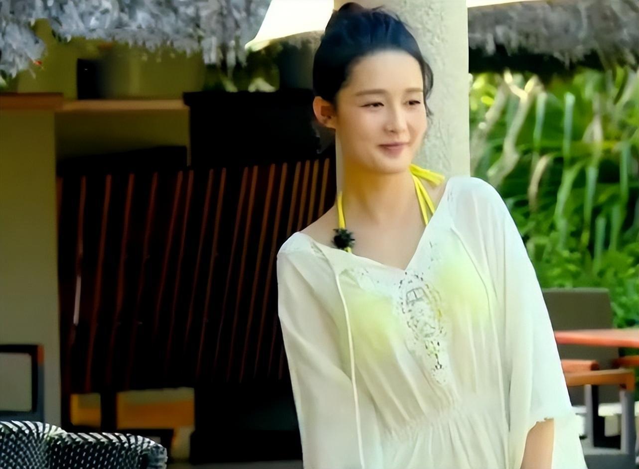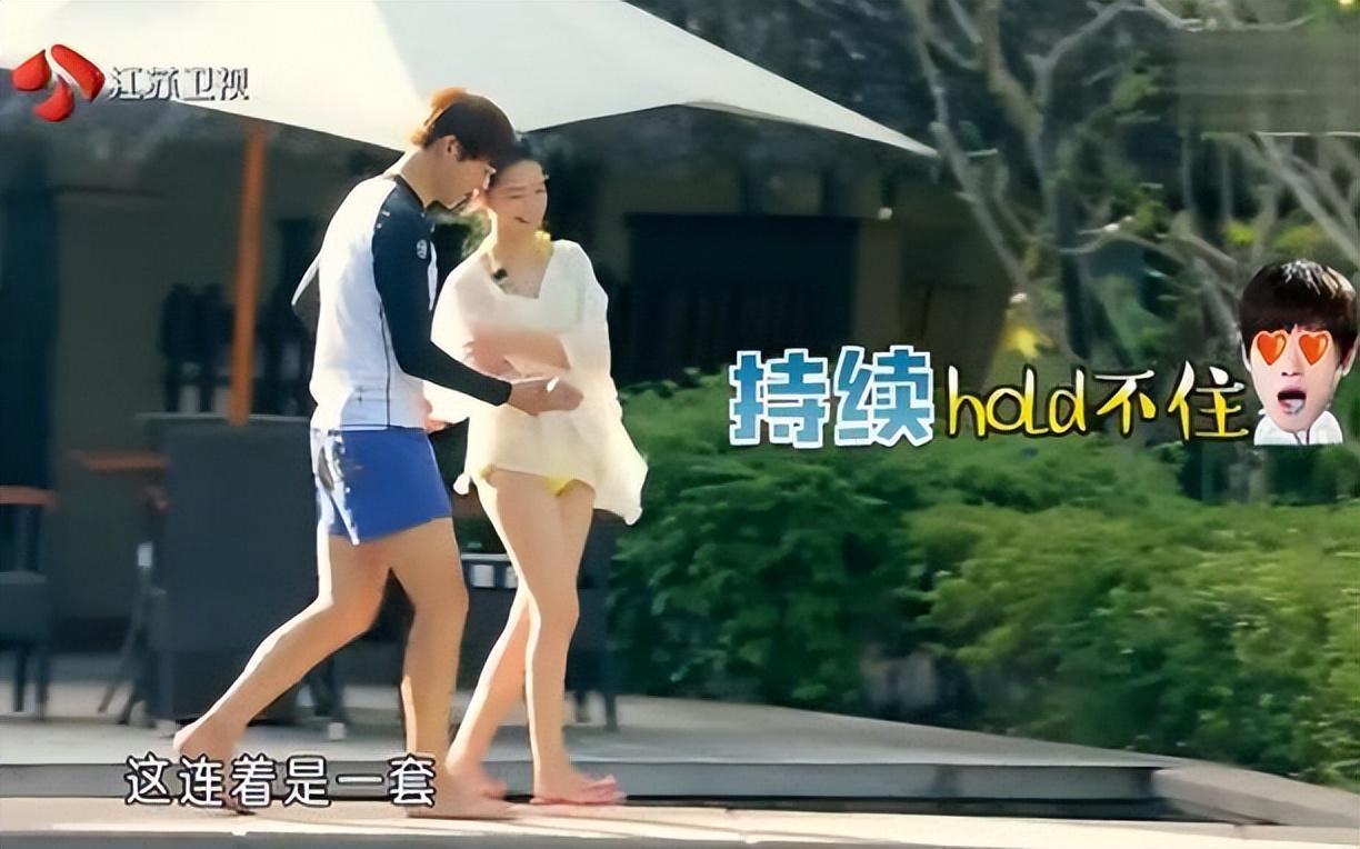 只見李沁穿著一身黃色比基尼,外面還配著白色披風,明眼人都看得出這姑娘有些害羞。