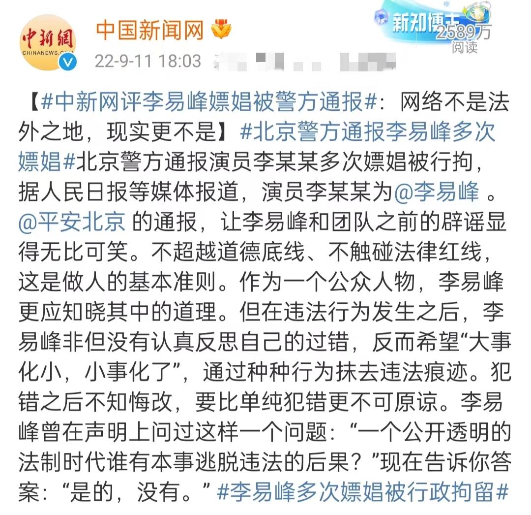 9月11日,警方通報知名演員李易峰嫖娼被查獲,霎時間在網上引起軒然大波,惹得網友們議論紛紛,官媒也針對此事發表了評論。