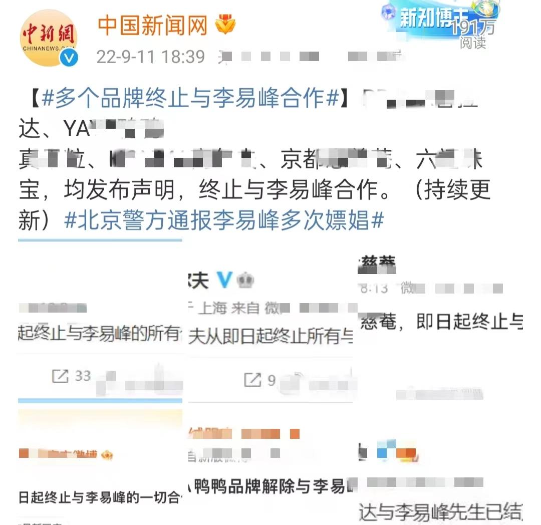 目前,李易峰代言的多個品牌先后宣布終止與他的合作,相關的品牌動態均被刪除。