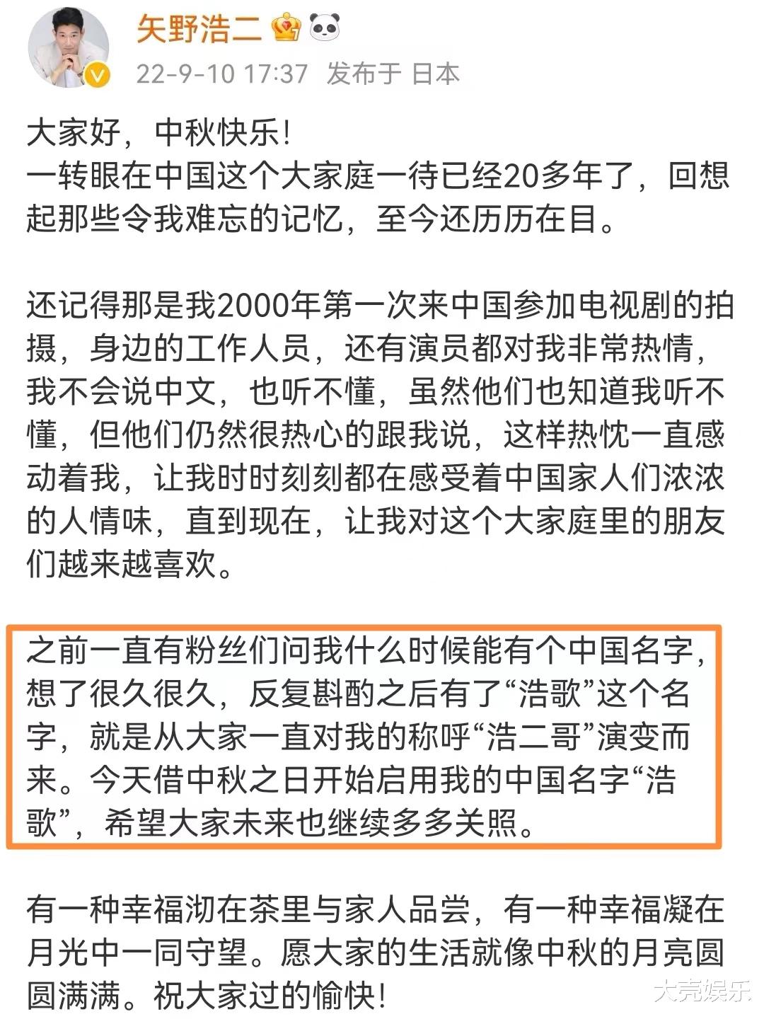 9月10日,矢野浩二在社交平臺發文祝大家中秋節快樂,他回顧了自己在中國二十多年的生活經歷。