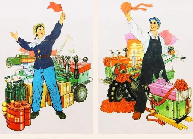 左邊畫面中,年輕的姑娘身穿工作服、頭戴安全帽,脖子上掛著哨子,手里舞動紅旗,指揮著吊車把一臺臺嶄新的農(nóng)具從支農(nóng)車上卸下來。地上擺滿了手扶拖拉機、農(nóng)藥噴霧器、化肥等農(nóng)用物資,這些可都是農(nóng)業(yè)生產(chǎn)急需的。