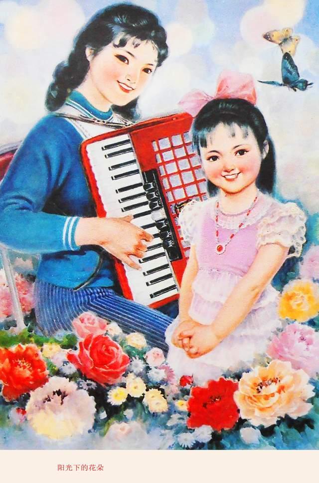 4.解讀、賞析:這幅年畫作品的標題為《陽光下美麗的花兒》,林美嵐,80年代。
