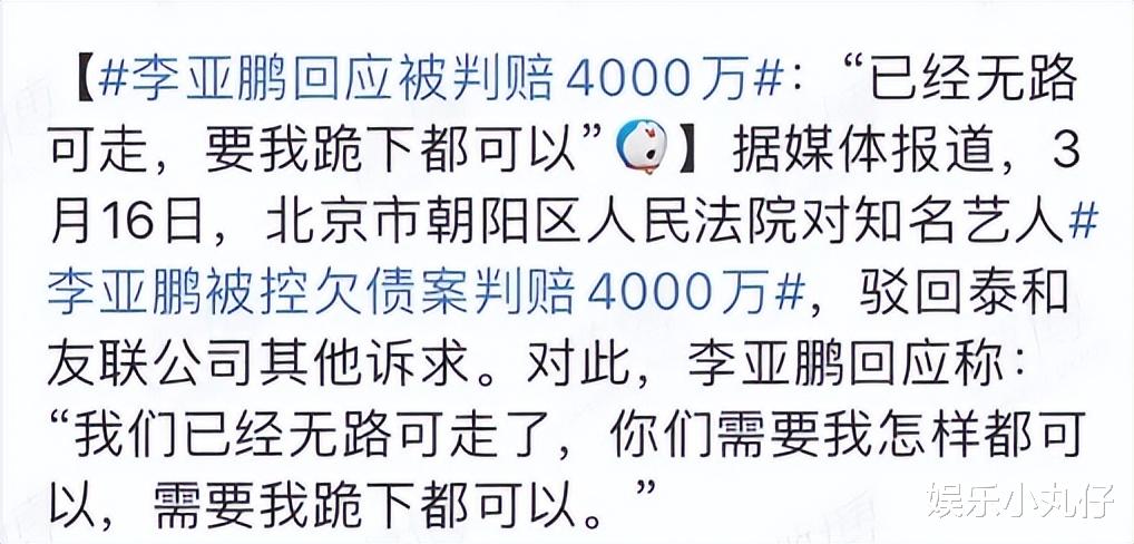 李亞鵬近日一直活躍在各大平臺熱搜榜上,不過卻是些負面新聞。前段時間,北京金融法院強制執行李亞鵬投資公司4.5億,引起網友熱議,認為他毫無誠信,紛紛喊話他趕快還錢,不過本尊全程視而不見。