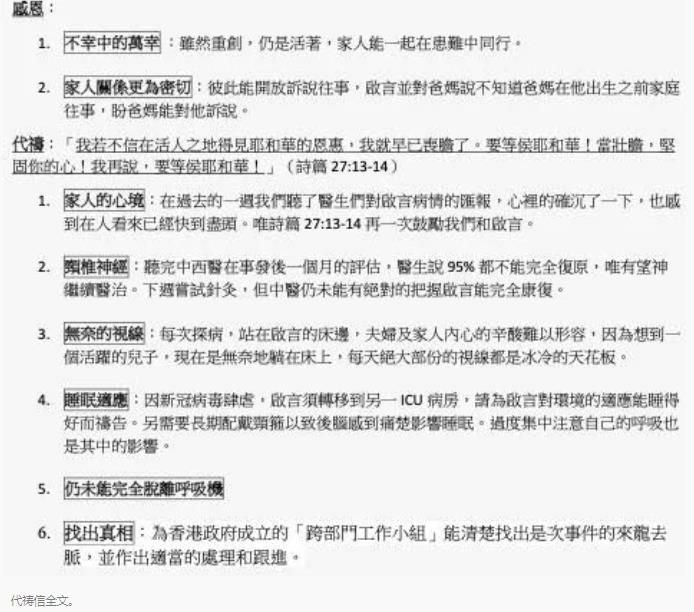 阿Mo父親李盛林牧師4日發表6大聲明說明阿Mo的最新狀況,目前阿Mo已經可以和父母對話,家人關系更加密切,但他仍不能完全脫離呼吸器,也因為長期配戴頸箍,導致后腦相當疼痛,影響睡眠。