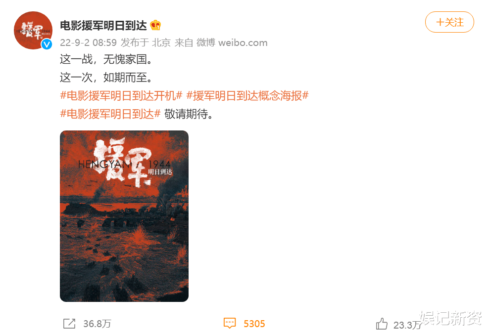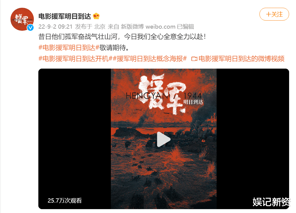 9月2日,又一部作品開拍引起了網友們的注意,這就是楊洋的電影《援軍明日到達》。這部劇是一部戰爭題材的作品,籌備了好幾年終于開始拍攝了。
