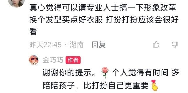 還有人給金巧巧提建議,讓她多花一些時間放在形象打理上,而金巧巧的回答很接地氣,她表示要把時間用在孩子身上,這比打扮自己更重要。