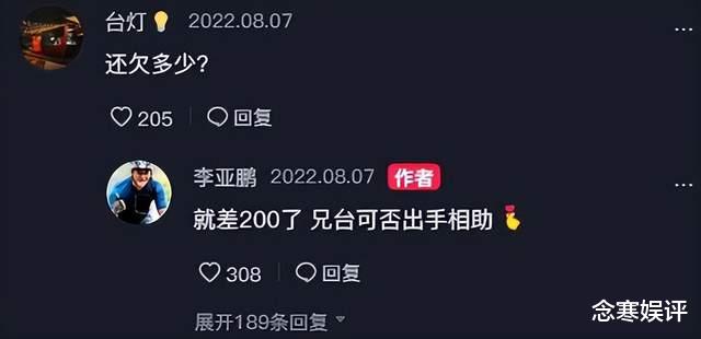 甚至他還不惜自降身段,走上了直播帶貨的道路,成為了一個帶貨主播。其中有一段對話讓人看完后,心里頭是五味雜陳,有影迷問他目前還欠多少錢,李亞鵬開玩笑說道:“就差200了,兄臺可否出手相助。”