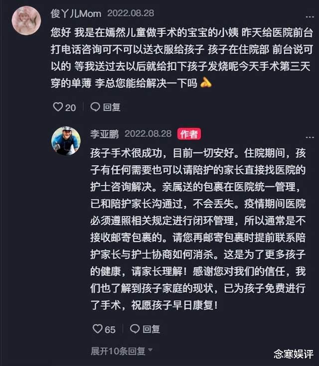 近日,一位自稱在嫣然天使兒童醫院做過手術的病患家屬,為了能夠尋求到幫助,特意跑到知名男演員李亞鵬社交賬號底下留言,希望他能夠幫解決一下給住院孩子送衣服的問題,沒想到卻得到了對方的耐心答復,引起了很多人的關注。