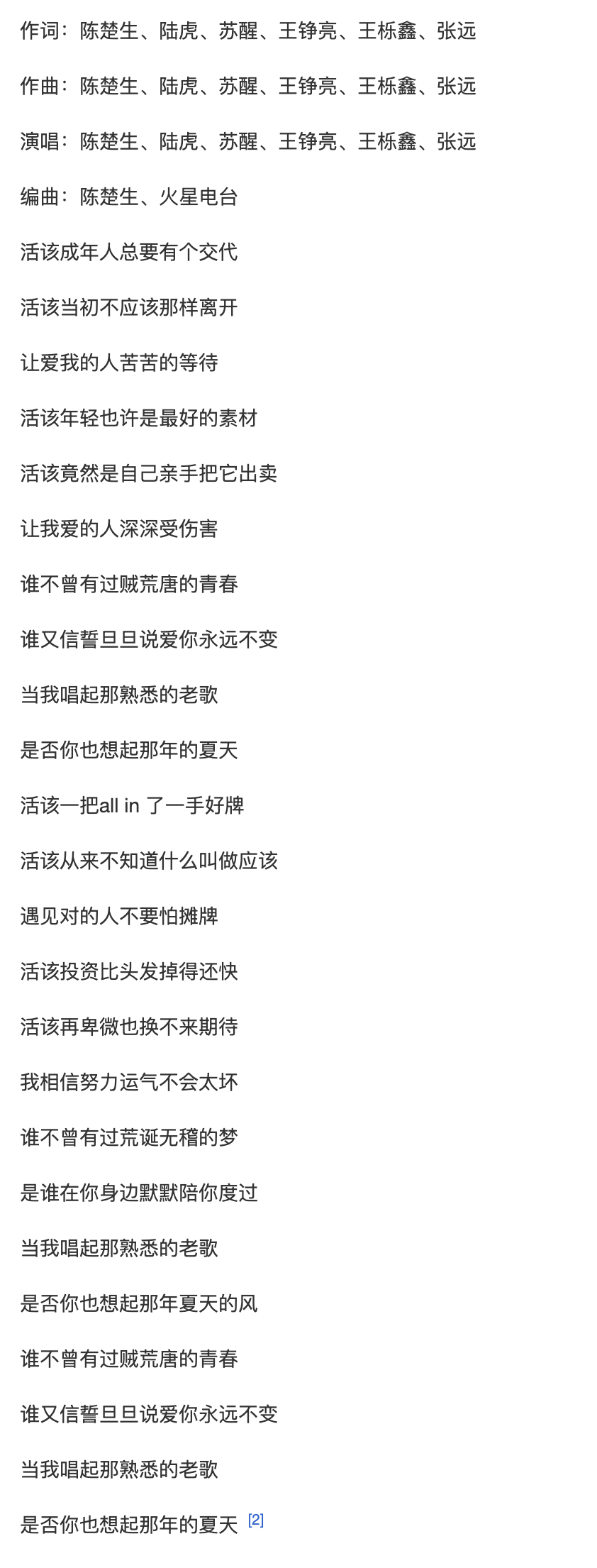 他們或許很多年不見了,可是卻好似有刻在骨子里的連結與默契,其中一個人哼出一段旋律,另外幾個分別加上幾句,這么玩著唱著,就共同寫出了一首歌,他們給它取名叫《活該》,歌名好似諷刺嘲笑,又像是對過往人生的感慨,歌詞被時光雕刻的漫長記憶與厚重情懷填滿,又似乎裝不滿他們飽滿的情緒與熱烈的情誼。